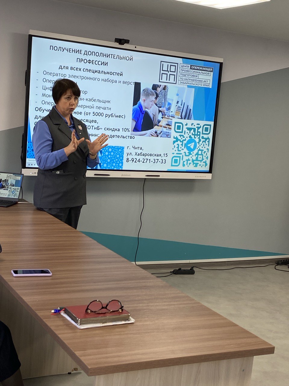 Затем слово взяла руководитель центра опережающей подготовки- Ленская Наталья Витальевна. Она сказала, что ребятам предлагается множество курсов, повышающих общую квалификацию, способные расширить умения и углубить знания получаемой профессии. Озвучено приглашение на расширение и повышение собственного уровня общей профессиональной подготовки.