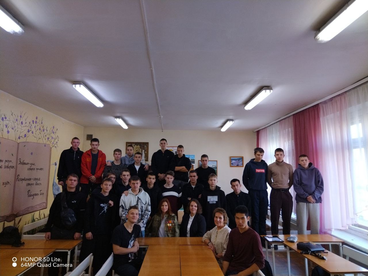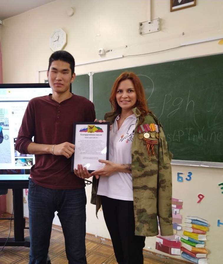 Для нас стало неожиданностью, когда в аудитории во время классного часа появилась женщина в накинутом на плечи офицерском кителе. С левой стороны блеснули ордена и медали. Она представилась нам. Оказалось, что на ней китель мужа, а сама является участницей проекта «Жены Героев Забайкальского края». Кстати, проект интересный, очень значимый для этих женщин и, конечно, для Забайкалья. Ксения (она назвала только имя) вручила ребятам Благодарственное письмо за их волонтёрскую деятельность. И эта награда очень важна для нас всех, потому что она подтверждает, что мы тоже часть нашего народа!