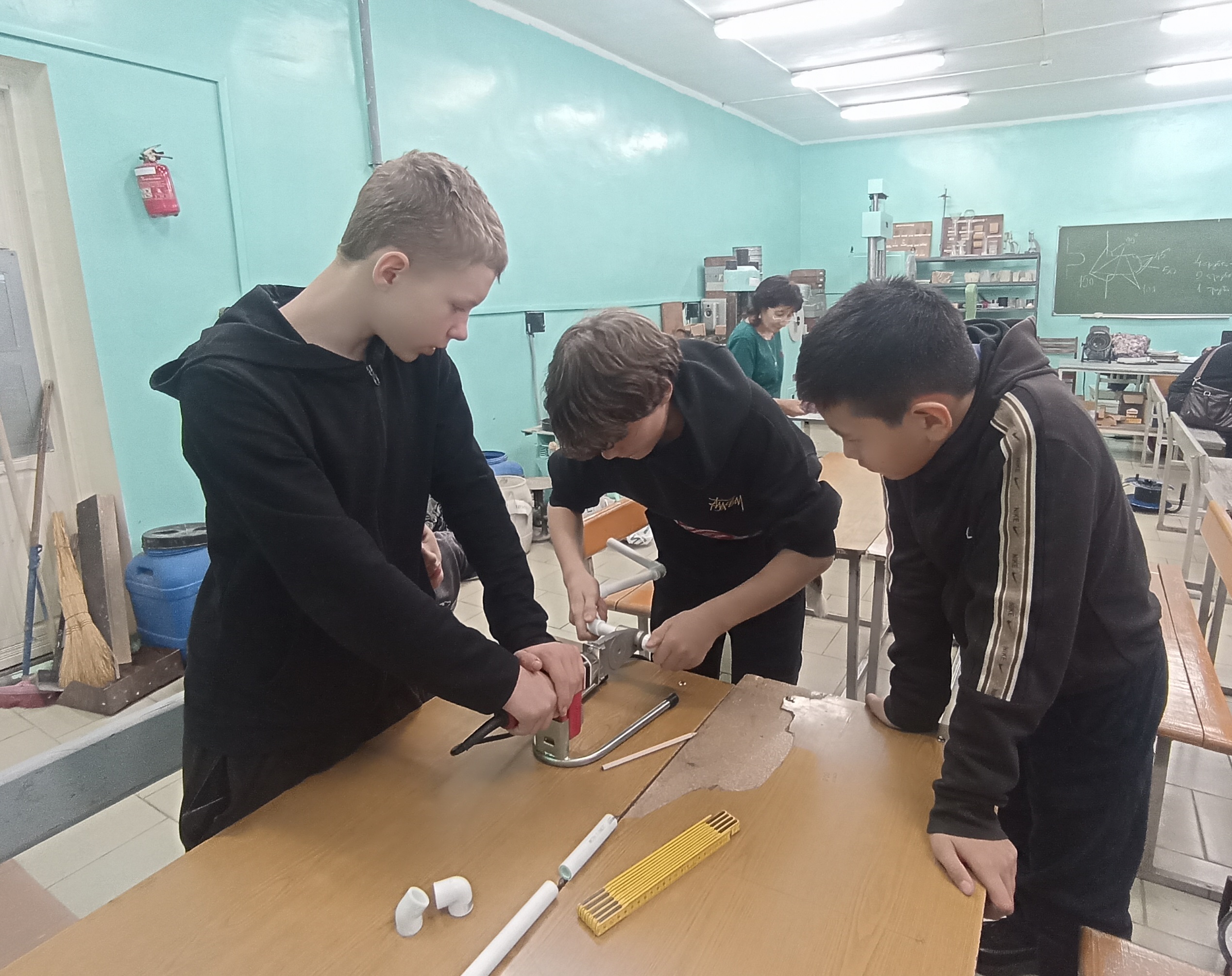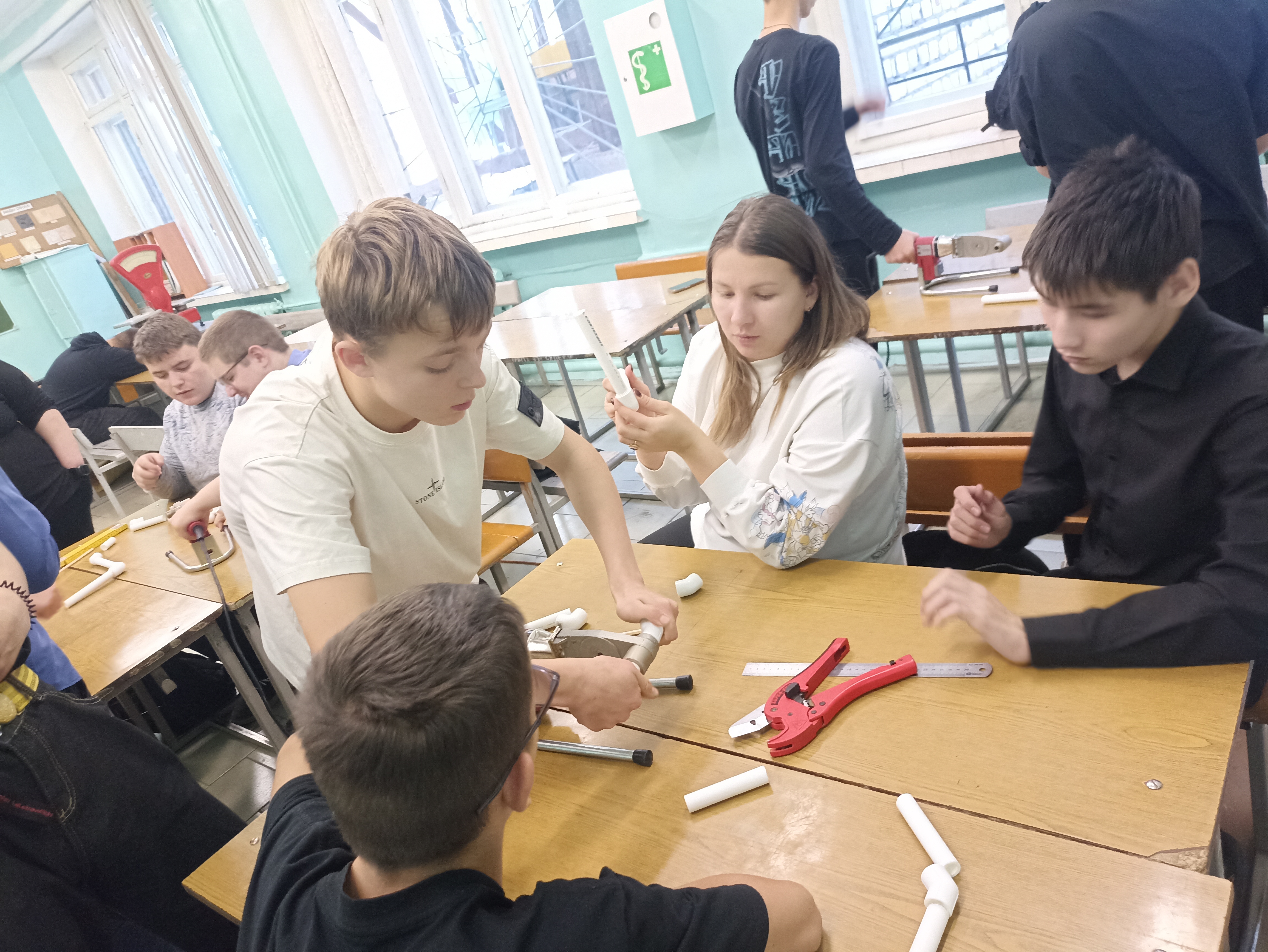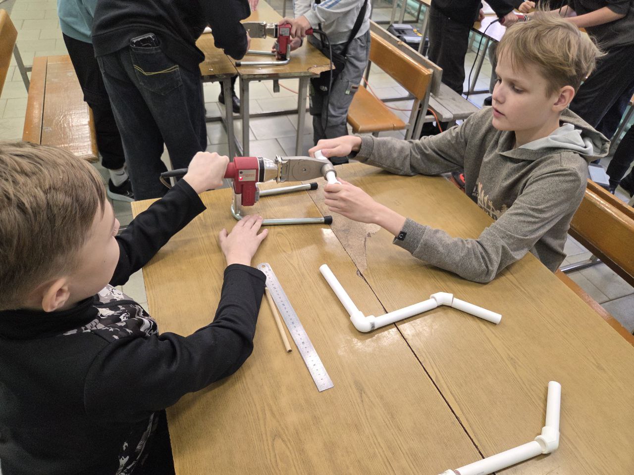 Под руководством наставника школьники читали чертеж, наносили разметку, производили резку и пайку полипропиленовых труб.
