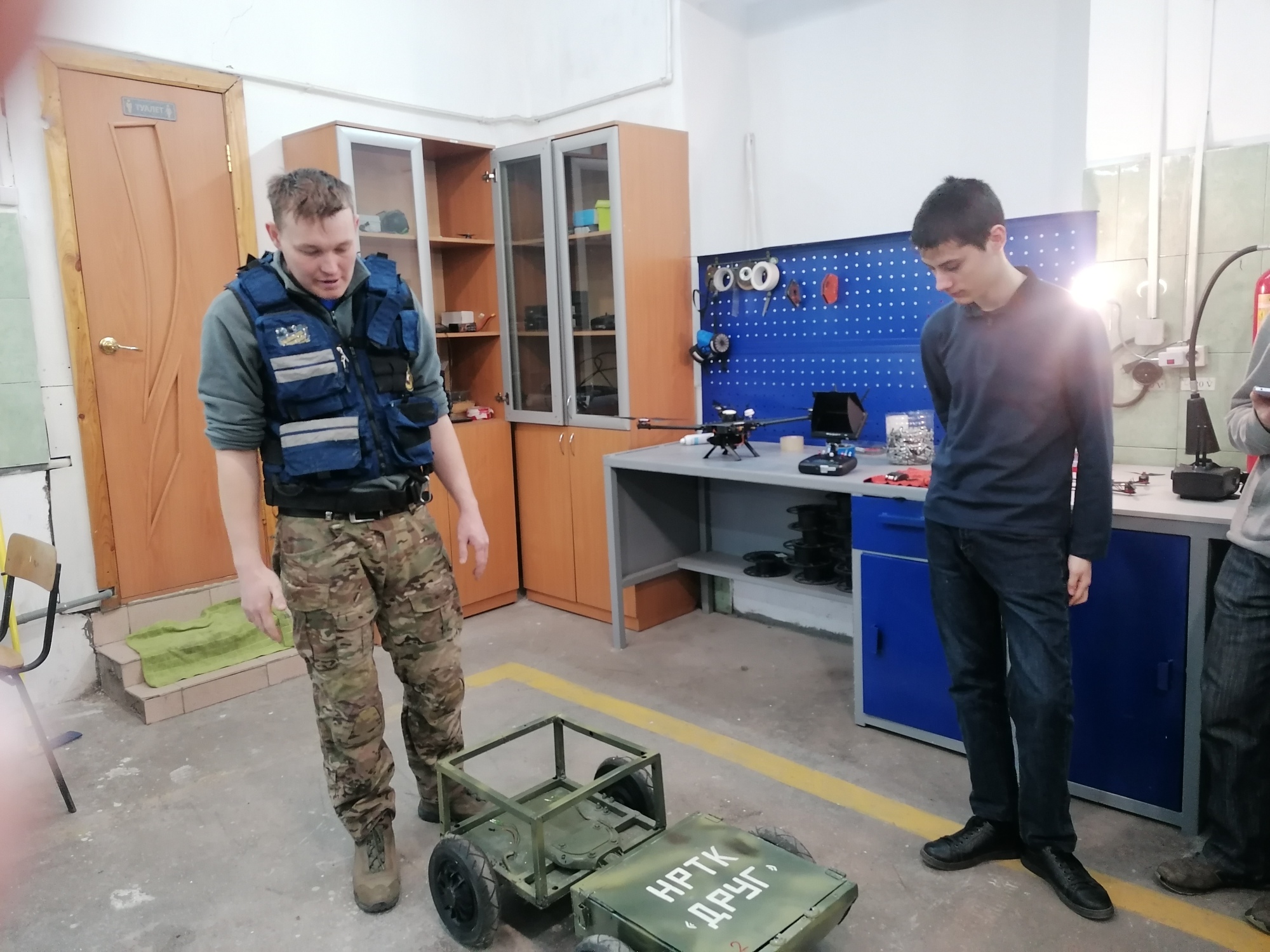 Нам были продемонстрированы самоходные машины «Друг», «Панцирь» и… Название одной из них сразу вызвало улыбку - «Проходимец». 27 единиц уже отправлено на передовую, и все зарекомендовали себя с положительной стороны. Руководитель рассказал, что собирать комплектующие приходится с помощью школьников, студентов, добровольцев. Удивила разработка машины – сапёра. О возможностях маленькой птички – дрона тоже было рассказано. У Ивана и его команды большие планы. Сам он является мозговым центром этого важного дела. Увлечённо рассказывает о том, что уже сделано. Сегодня участники выигрывают гранты, сотрудничают с платформой «Добро.рф». Наш выпускник рассказал историю корпуса, провёл нас по учебным комнатам, продемонстрировал некоторые технические средства, показал, как они используются в разных ситуациях. Например, чем можно помочь животному, провалившемуся в глубокую яму. Использование новых технологий во время чрезвычайных ситуаций облегчает работу спасателей.