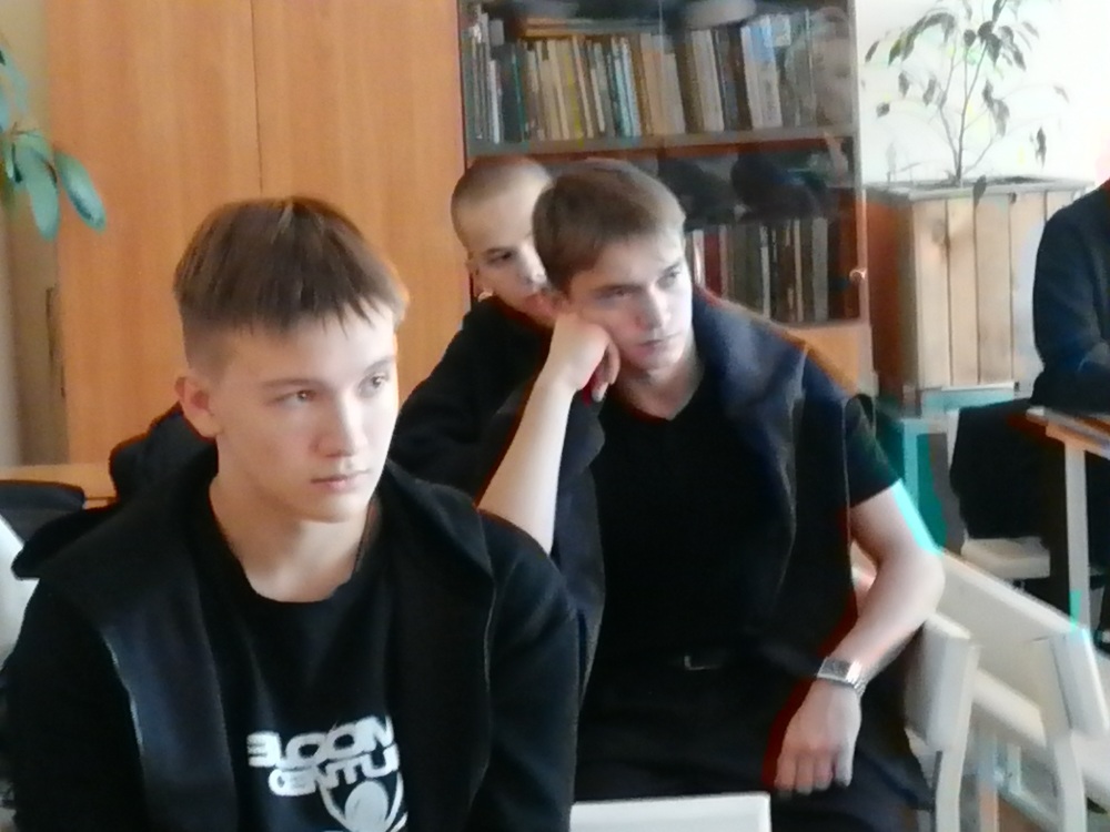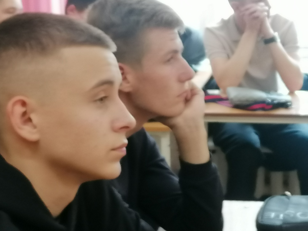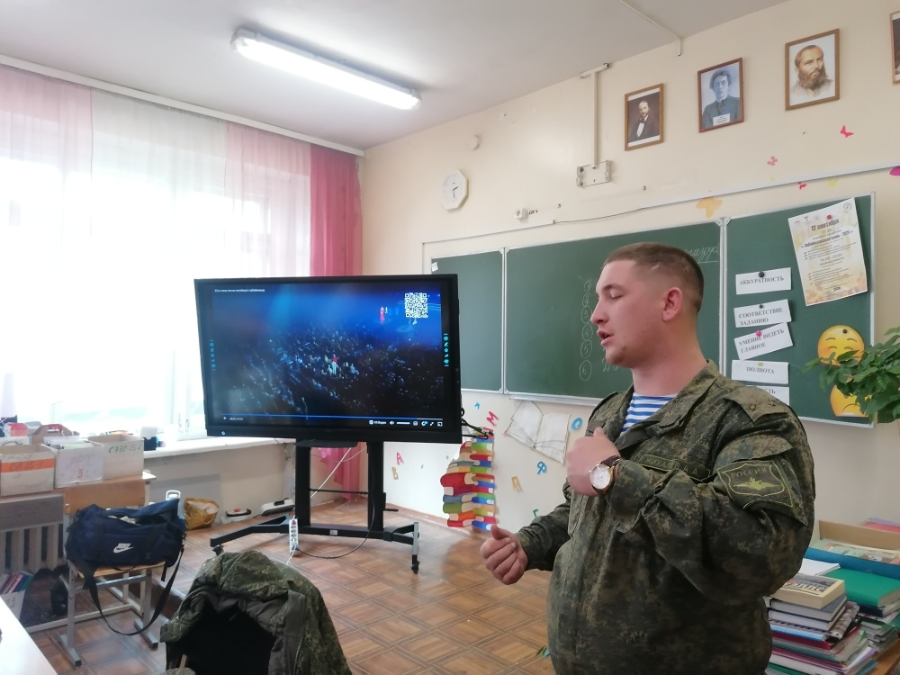 В самом начале классного часа ребятам было предложено посмотреть видеоролик, где певица Юта рассказывает о нашем земляке Алексее Подопригоре, который погиб в феврале 2025 года в зоне СВО. Ребята узнали о Герое России, услышали его песню «Ты помни». А после просмотра наш гость сказал, что он знал этого человека. Вот так и протянулась невидимая ниточка, связывающая судьбы людей одного поколения.